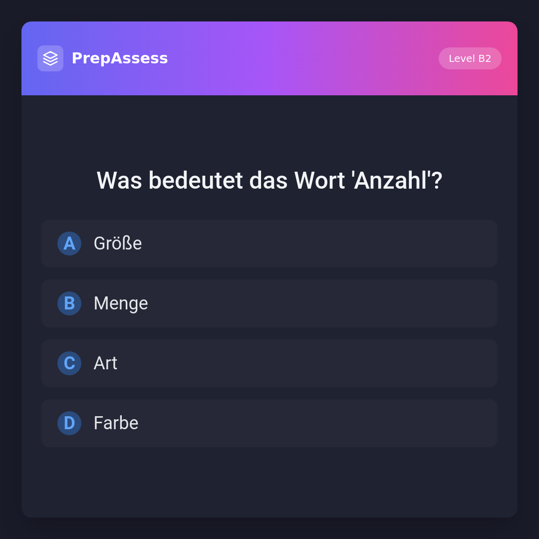 Das Wort 'Anzahl' bedeutet 'Menge'. 'Größe' bezieht sich auf Dimensionen, 'Art' auf die Art oder Weise von etwas, und 'Farbe' auf die visuelle Wahrnehmung.