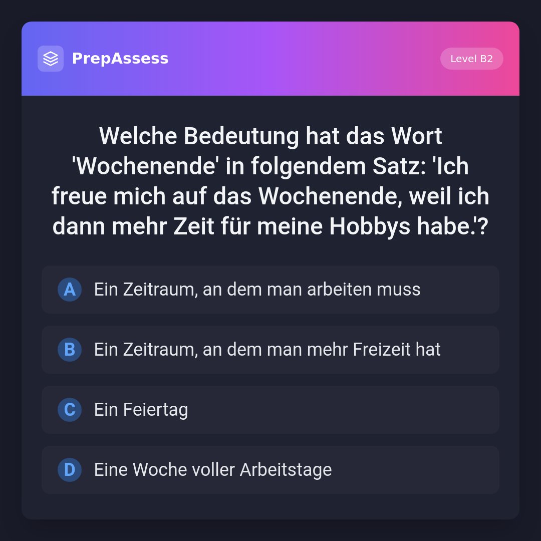 Welche Bedeutung hat das Wort 'Wochenende' in folgendem Satz: 'Ich freue mich auf das Wochenende, weil ich dann mehr Zeit für meine Hobbys habe.'?