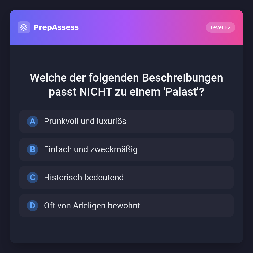 Welche der folgenden Beschreibungen passt NICHT zu einem 'Palast'?