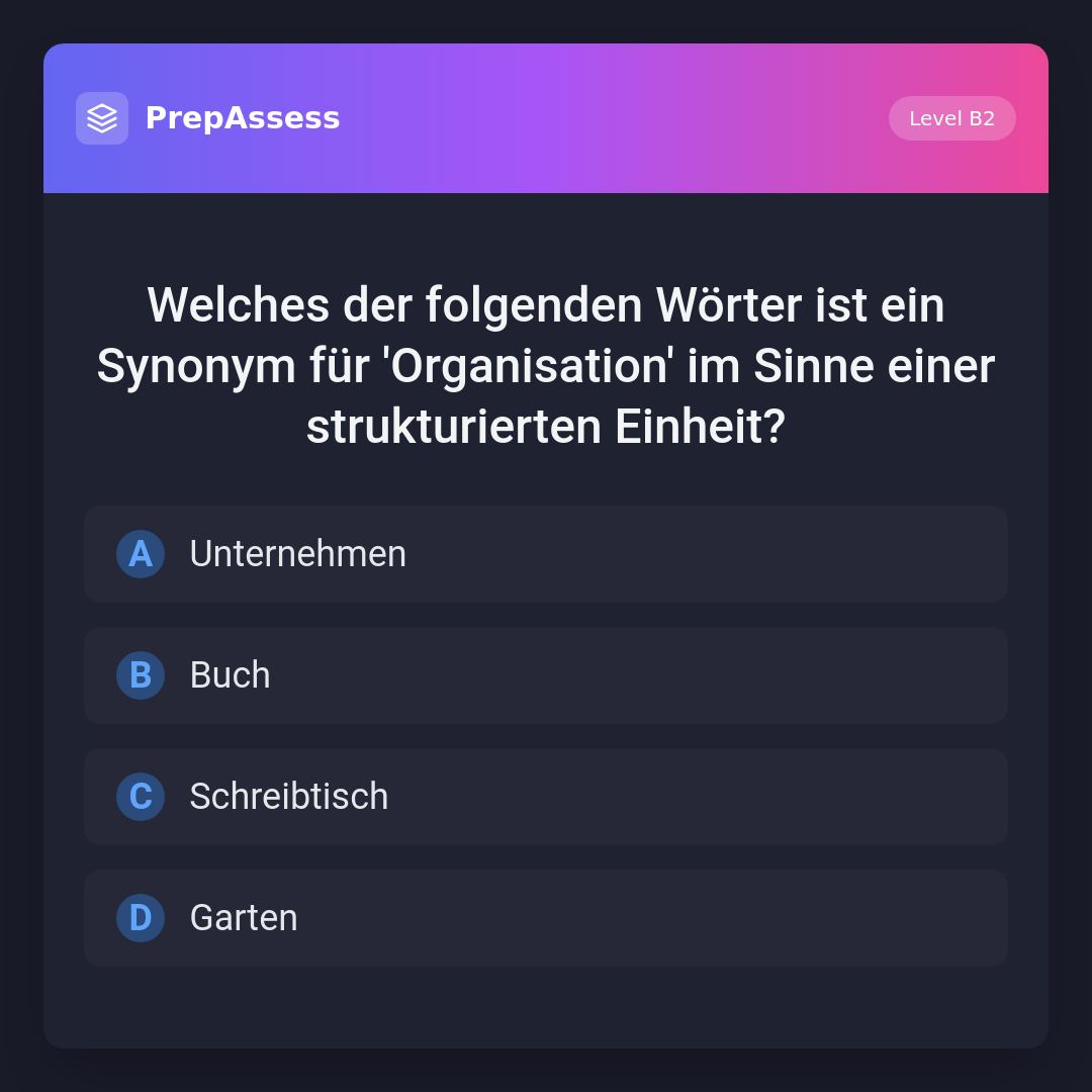 Welches der folgenden Wörter ist ein Synonym für 'Organisation' im Sinne einer strukturierten Einheit?