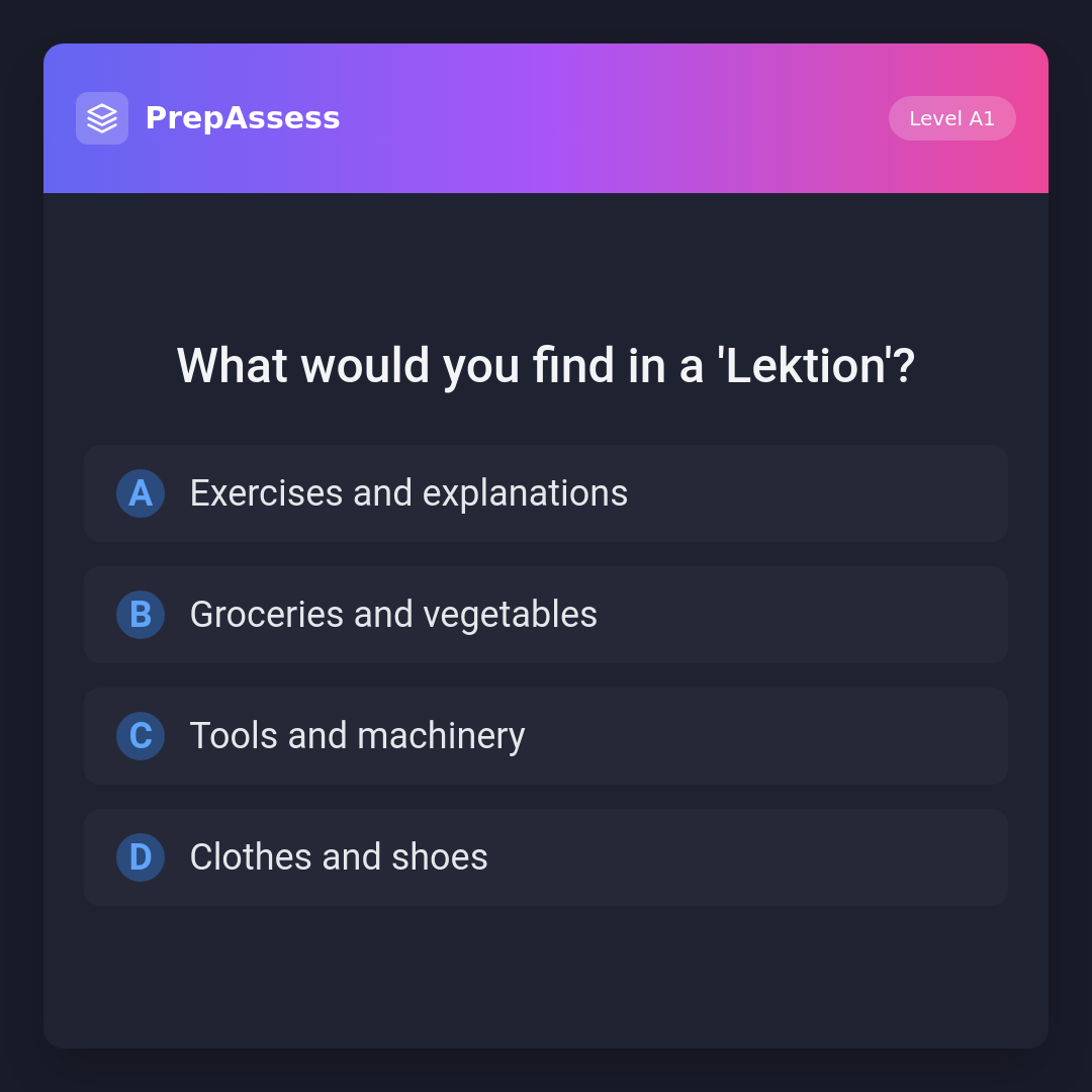 A 'Lektion' usually includes exercises and explanations, as it is a lesson. Options 'b', 'c', and 'd' list items unrelated to a lesson context.