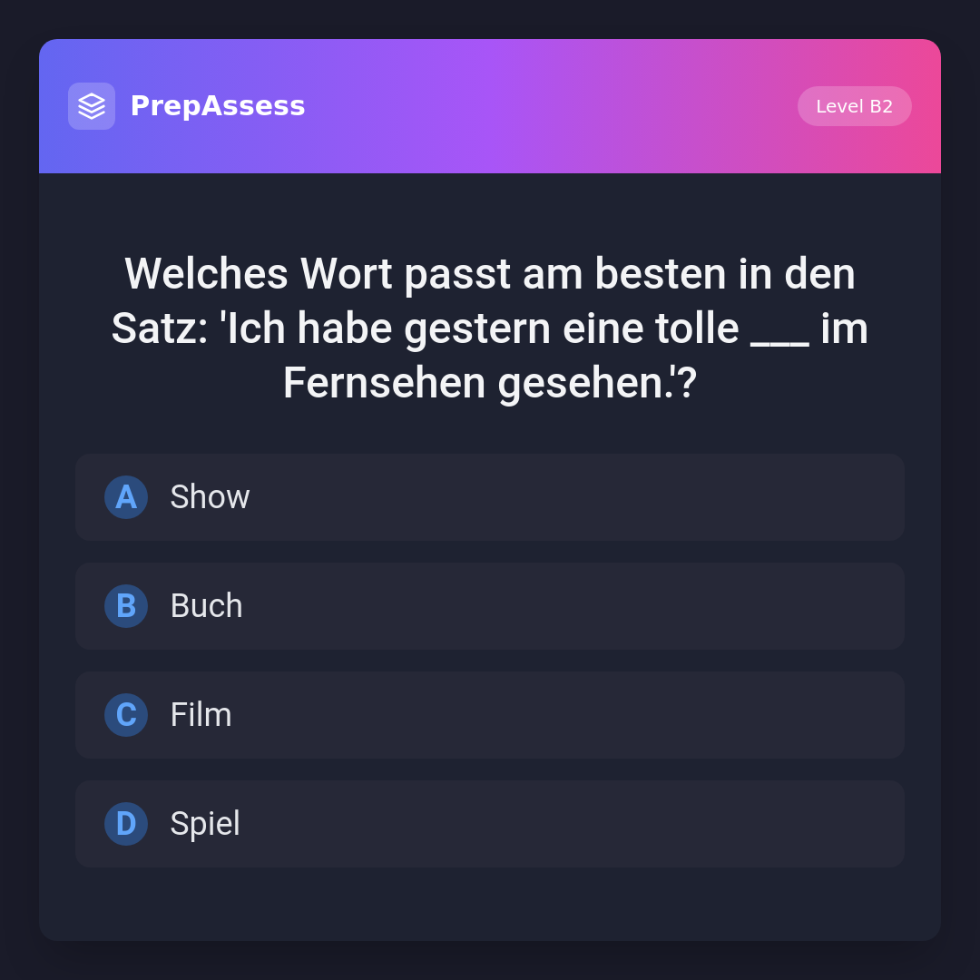 Welches Wort passt am besten in den Satz: 'Ich habe gestern eine tolle ___ im Fernsehen gesehen.'?