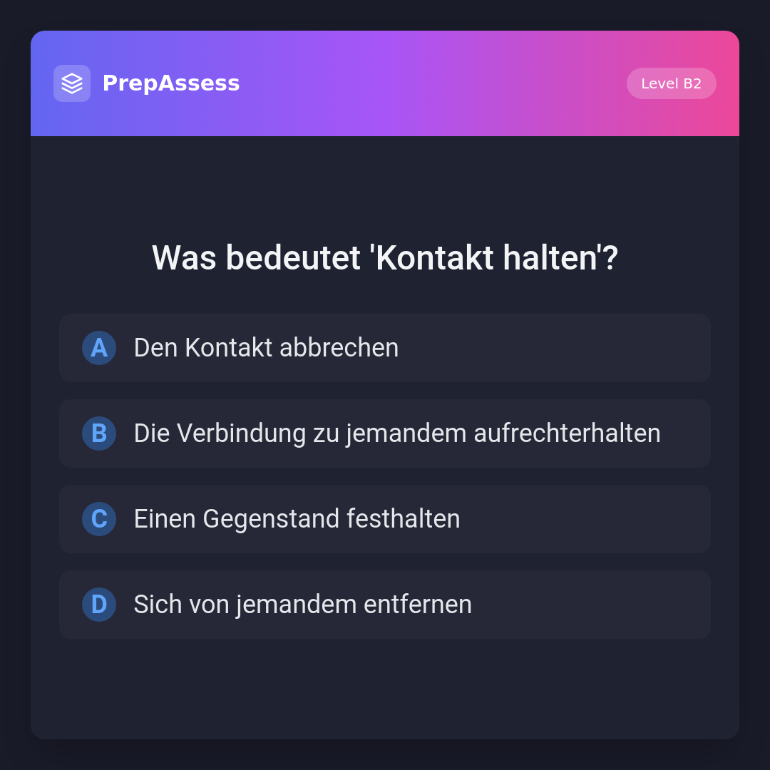 Die Redewendung 'Kontakt halten' bedeutet, die Verbindung oder Beziehung zu jemandem aufrechtzuerhalten. Die anderen Optionen beschreiben das Gegenteil oder sind unpassend.