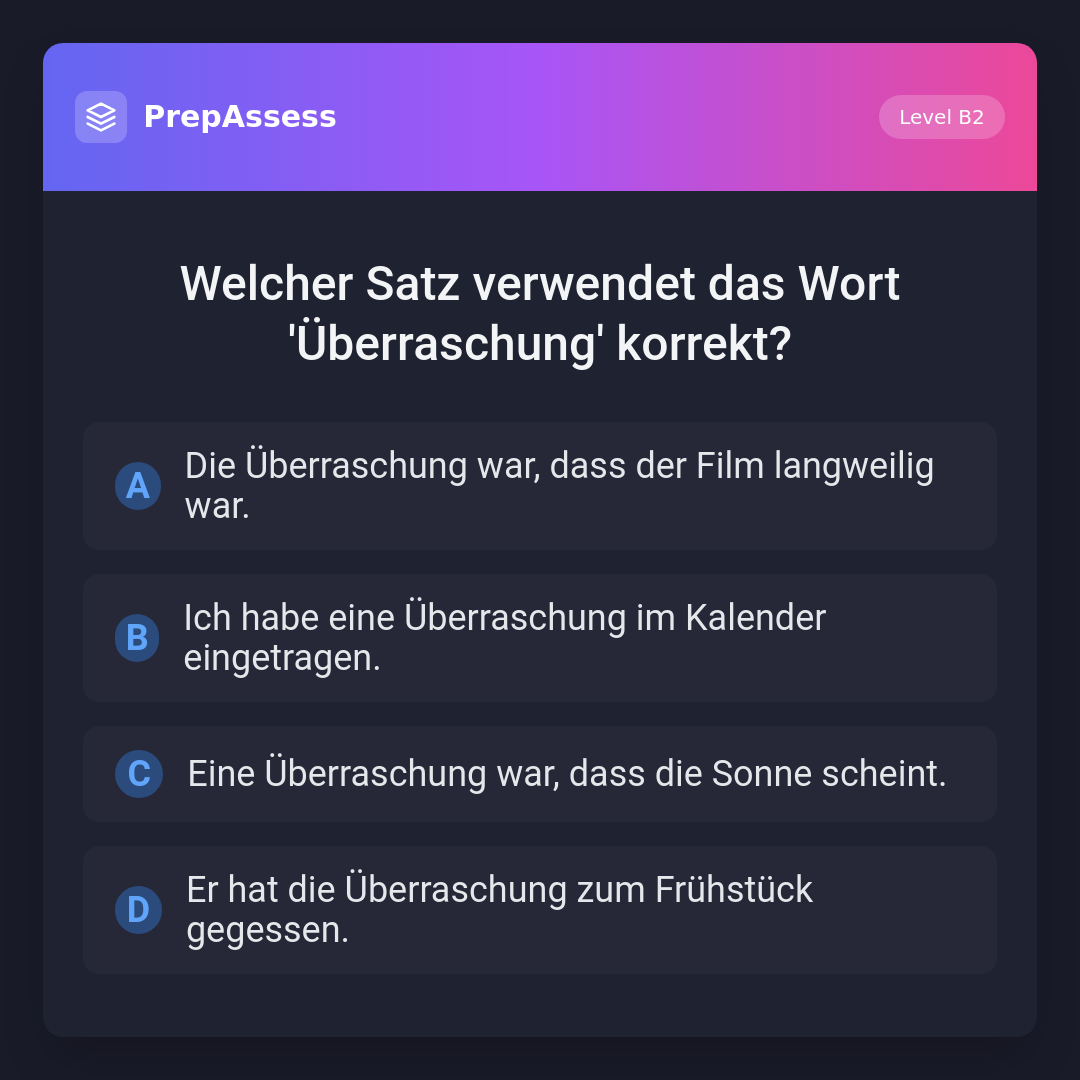 Welcher Satz verwendet das Wort 'Überraschung' korrekt?
