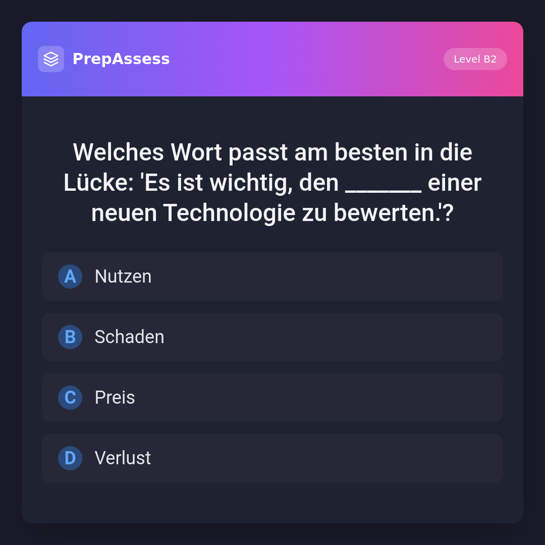 Welches Wort passt am besten in die Lücke: 'Es ist wichtig, den _______ einer neuen Technologie zu bewerten.'?