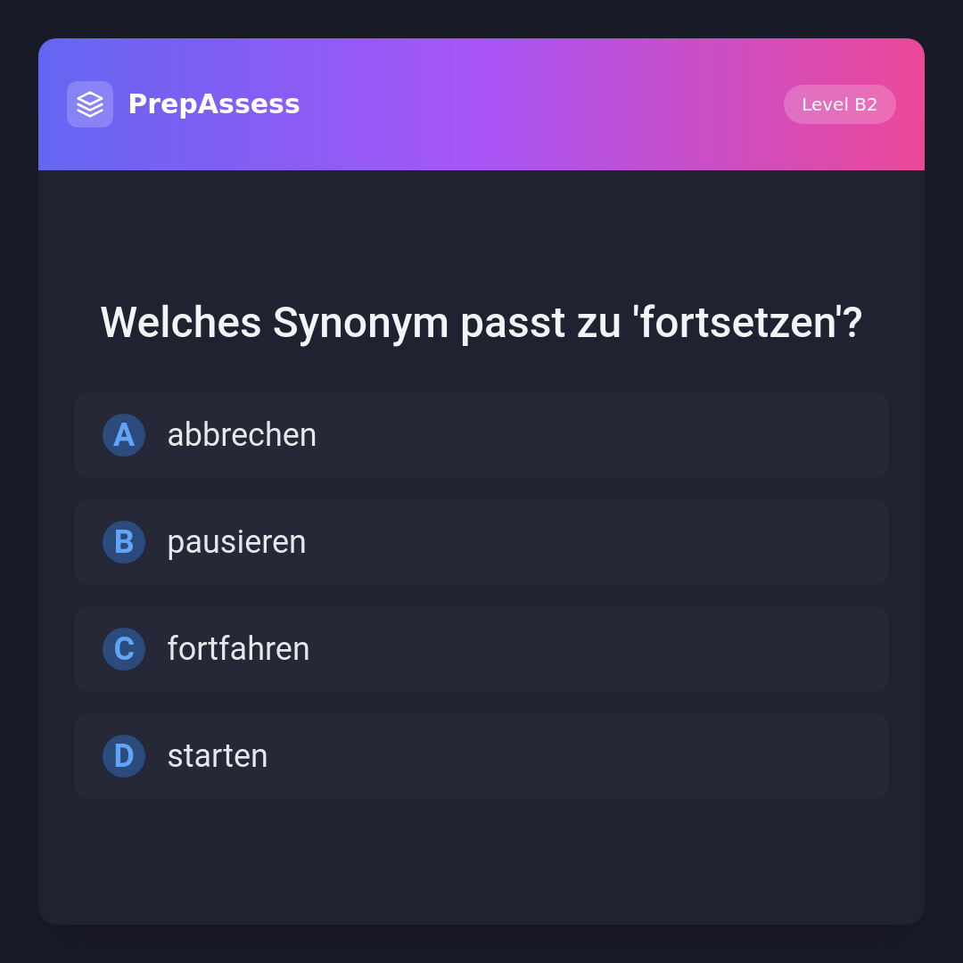 Das Synonym 'fortfahren' bedeutet ebenfalls, etwas weiterzuführen oder zu einem späteren Zeitpunkt weiterzumachen. 'Abbrechen', 'pausieren' und 'starten' haben andere Bedeutungen und passen nicht zu 'fortsetzen'.