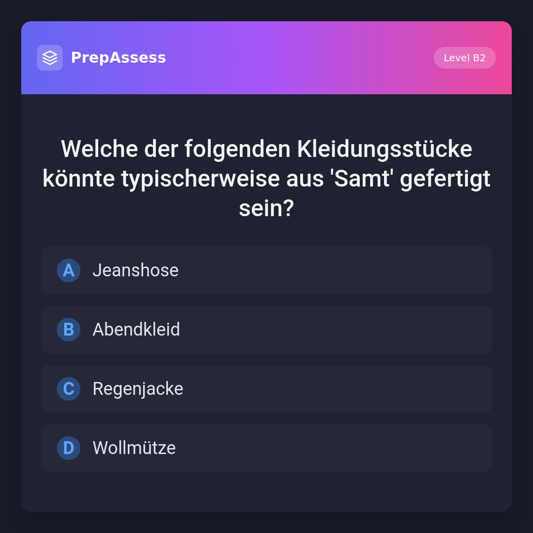 Welche der folgenden Kleidungsstücke könnte typischerweise aus 'Samt' gefertigt sein?