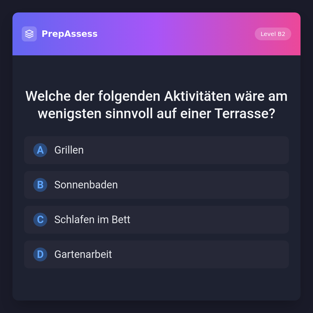 Welche der folgenden Aktivitäten wäre am wenigsten sinnvoll auf einer Terrasse?