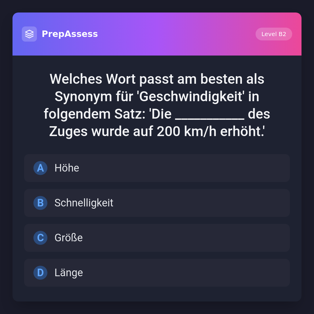 Welches Wort passt am besten als Synonym für 'Geschwindigkeit' in folgendem Satz: 'Die ___________ des Zuges wurde auf 200 km/h erhöht.'