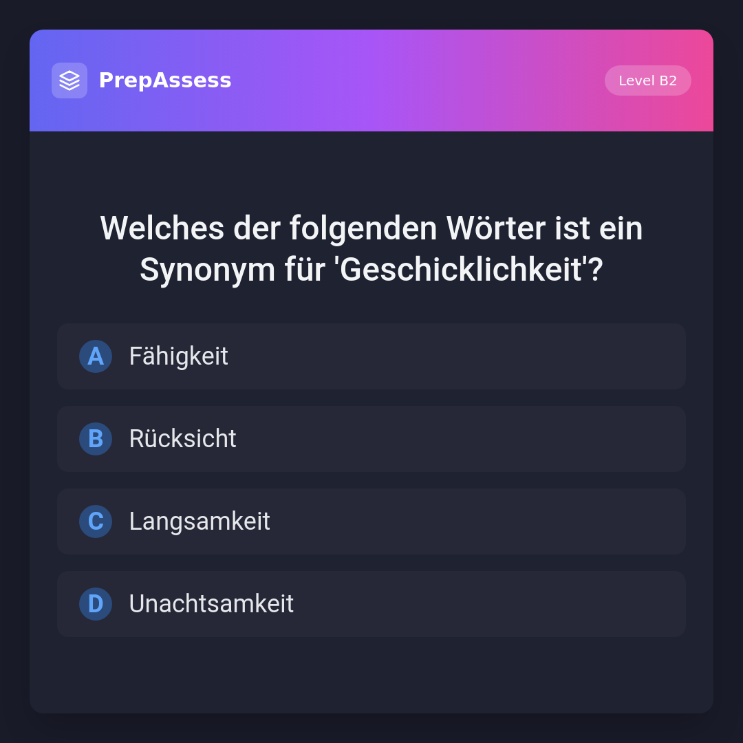Welches der folgenden Wörter ist ein Synonym für 'Geschicklichkeit'?