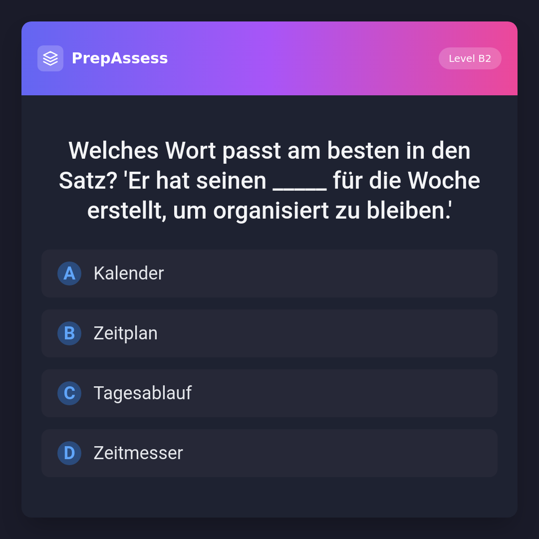Welches Wort passt am besten in den Satz? 'Er hat seinen _____ für die Woche erstellt, um organisiert zu bleiben.'