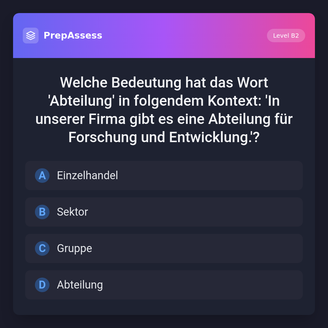 Welche Bedeutung hat das Wort 'Abteilung' in folgendem Kontext: 'In unserer Firma gibt es eine Abteilung für Forschung und Entwicklung.'?
