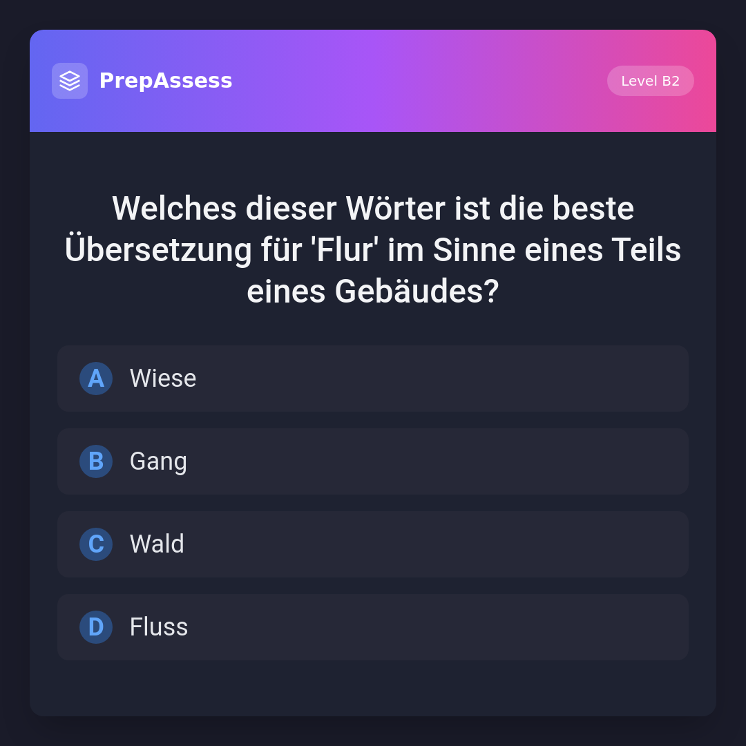 Welches dieser Wörter ist die beste Übersetzung für 'Flur' im Sinne eines Teils eines Gebäudes?