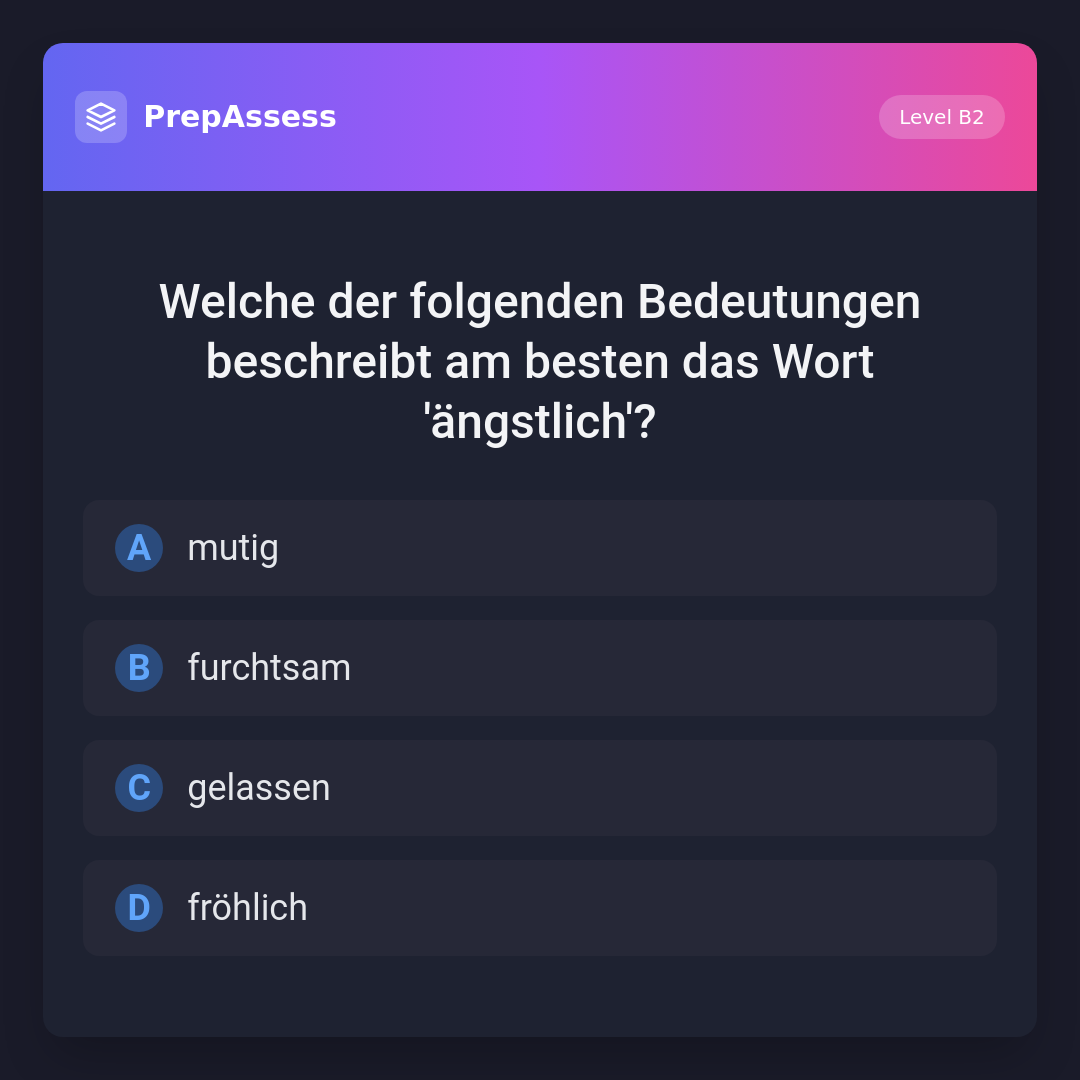 Welche der folgenden Bedeutungen beschreibt am besten das Wort 'ängstlich'?