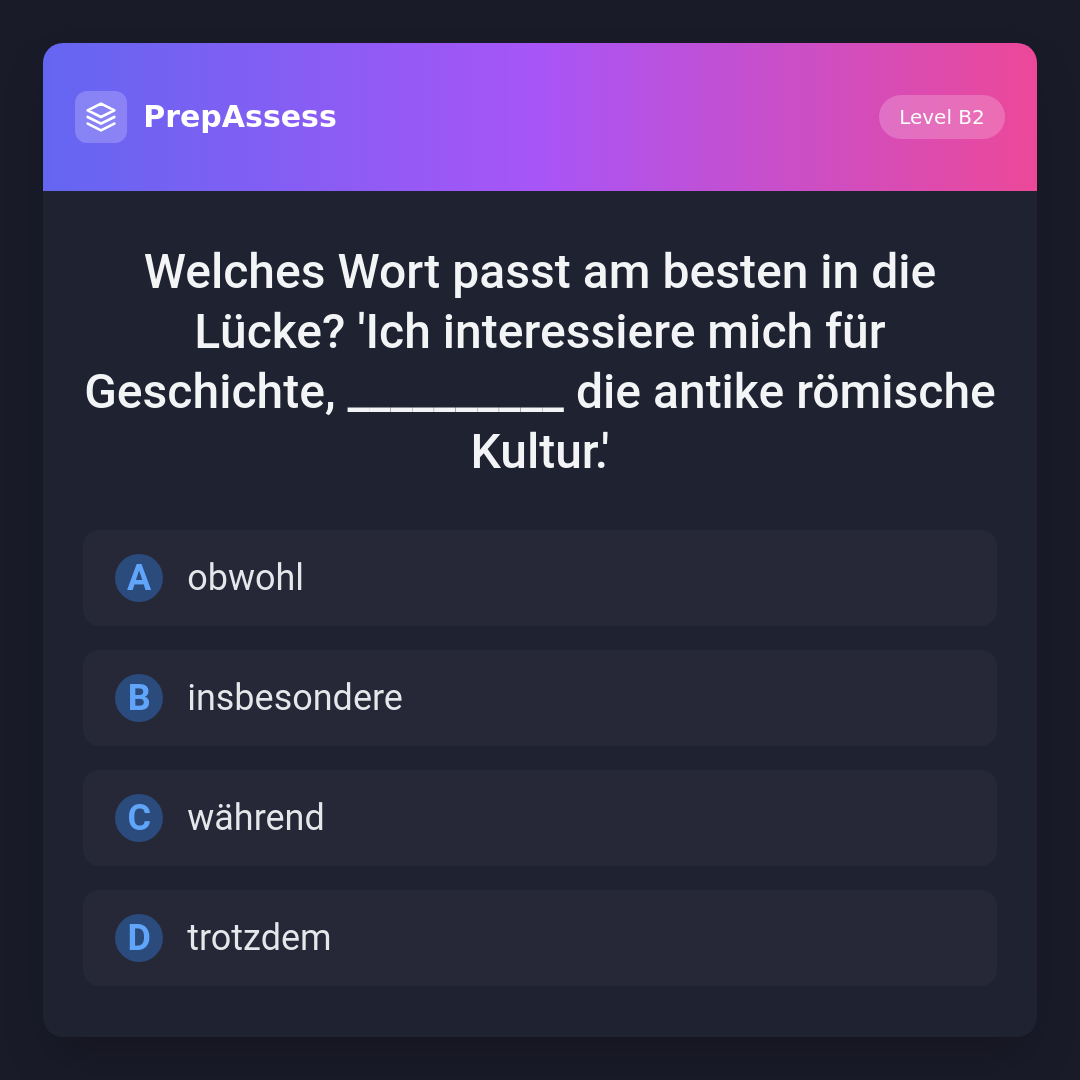 Welches Wort passt am besten in die Lücke? 'Ich interessiere mich für Geschichte, __________ die antike römische Kultur.'