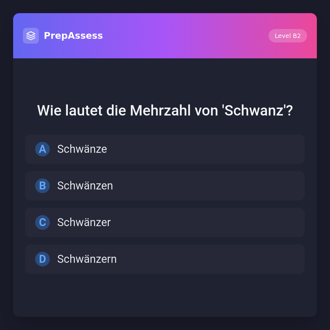 Die korrekte Mehrzahlform von 'Schwanz' ist 'Schwänze'. Die anderen Optionen sind keine gültigen Pluralformen für dieses Wort.