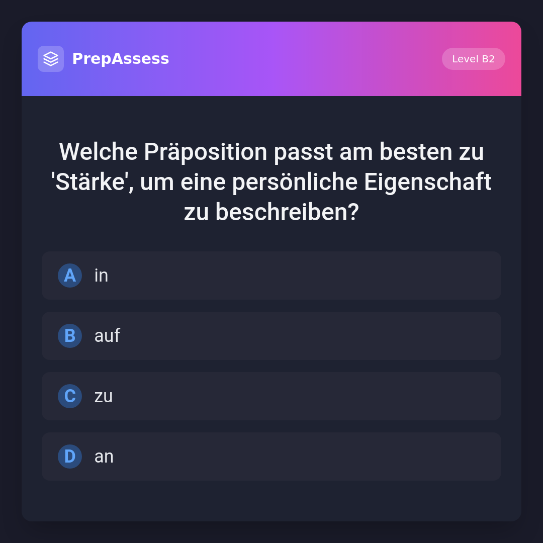 Welche Präposition passt am besten zu 'Stärke', um eine persönliche Eigenschaft zu beschreiben?