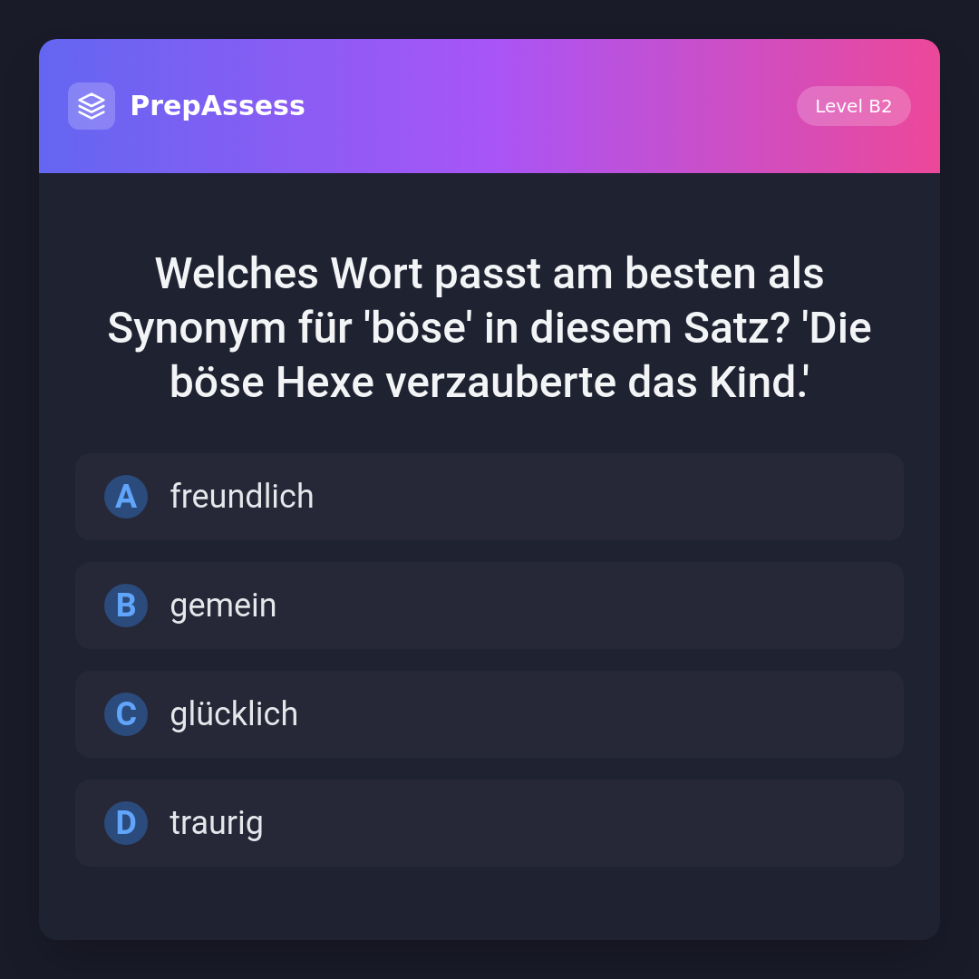 Welches Wort passt am besten als Synonym für 'böse' in diesem Satz? 'Die böse Hexe verzauberte das Kind.'