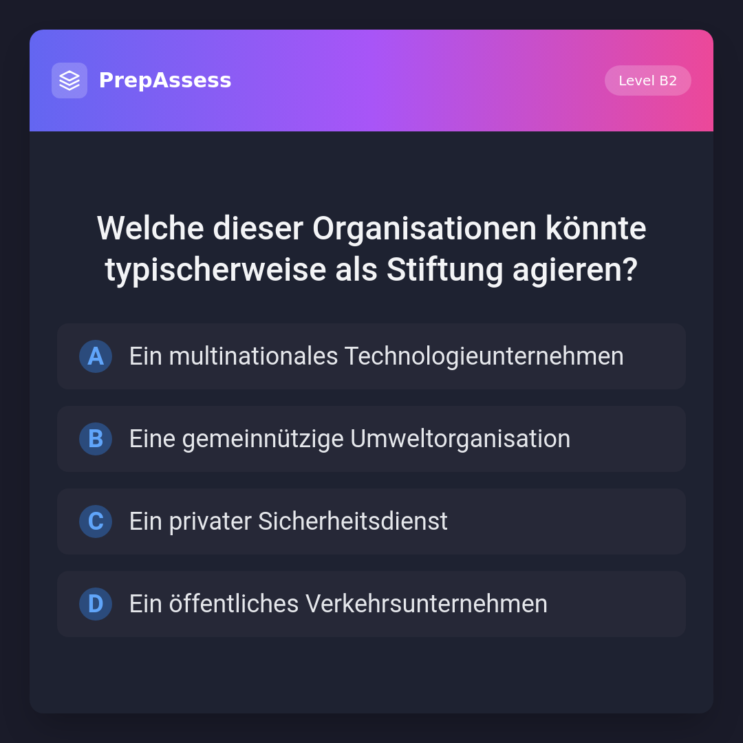 Welche dieser Organisationen könnte typischerweise als Stiftung agieren?