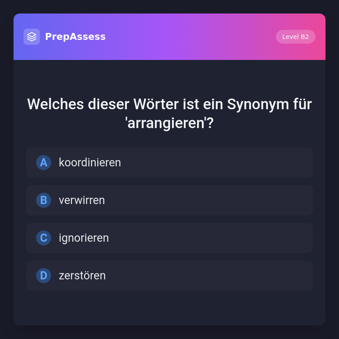 Welches dieser Wörter ist ein Synonym für 'arrangieren'?
