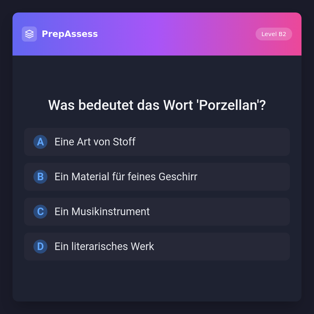 Porzellan ist ein feines, oft weißes keramisches Material, das häufig zur Herstellung von Geschirr und Dekorationsgegenständen verwendet wird. Es ist kein Stoff, Musikinstrument oder literarisches Werk.