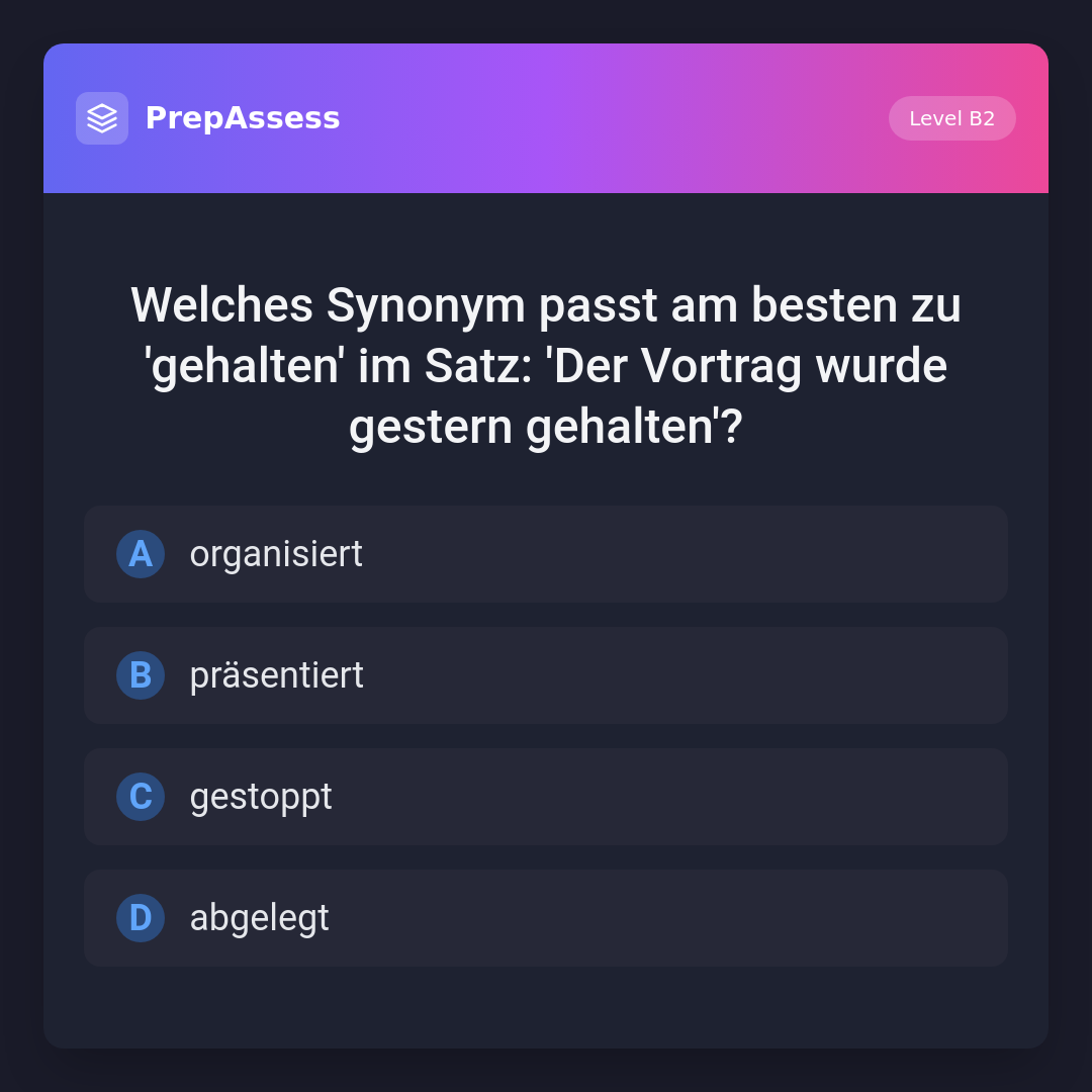 Welches Synonym passt am besten zu 'gehalten' im Satz: 'Der Vortrag wurde gestern gehalten'?