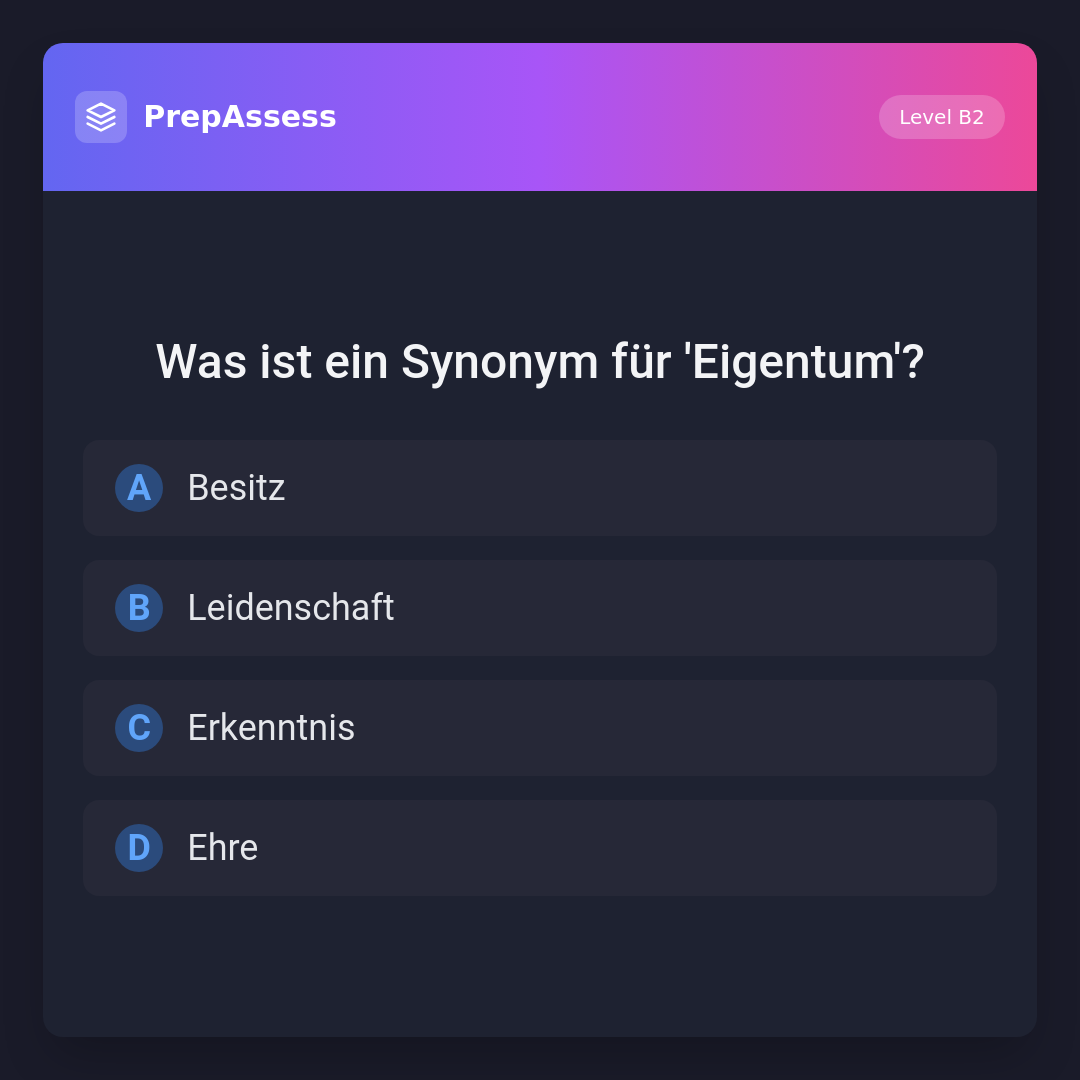 'Besitz' ist ein Synonym für 'Eigentum', da beide Wörter den Besitz oder die Zugehörigkeit zu jemandem beschreiben. 'Leidenschaft', 'Erkenntnis' und 'Ehre' haben andere Bedeutungen und sind daher unpassend.