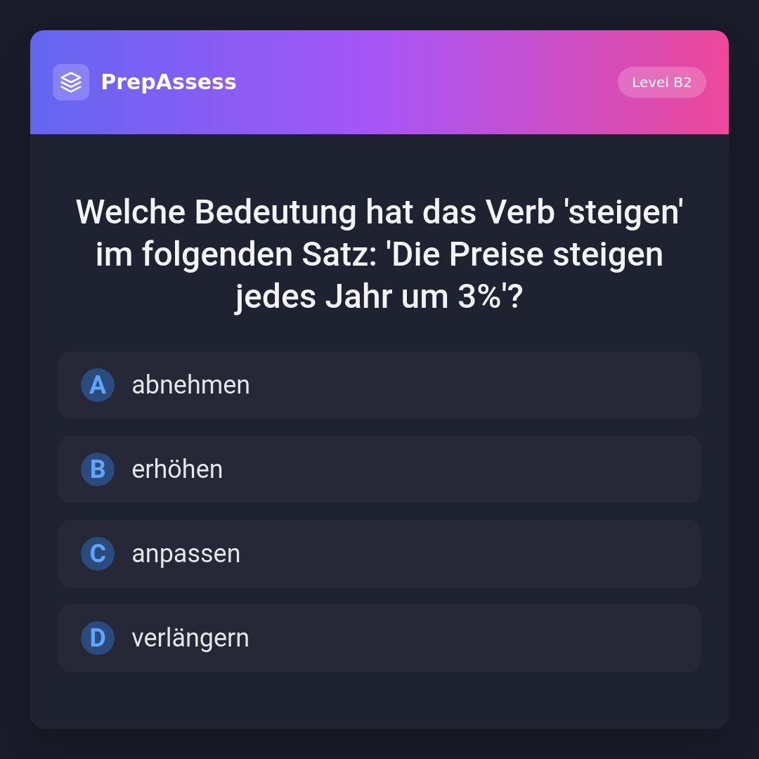 Welche Bedeutung hat das Verb 'steigen' im folgenden Satz: 'Die Preise steigen jedes Jahr um 3%'?