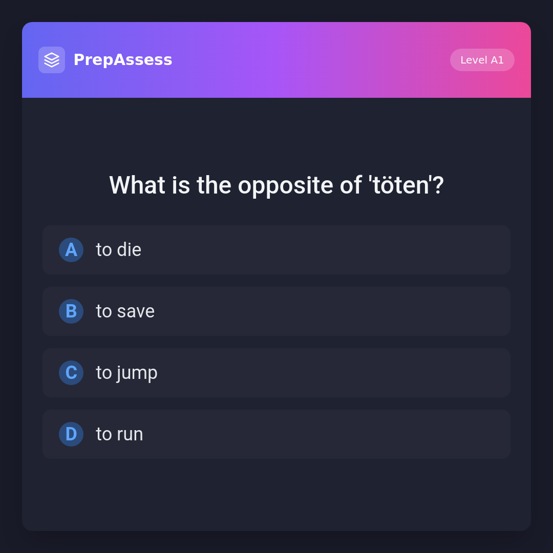 The opposite of 'to kill' (töten) is 'to save'. 'To die' is related but not the opposite, while 'to jump' and 'to run' are unrelated actions.