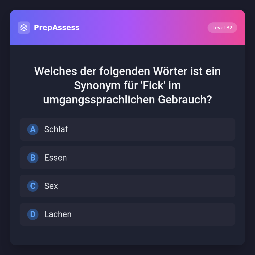 Welches der folgenden Wörter ist ein Synonym für 'Fick' im umgangssprachlichen Gebrauch?