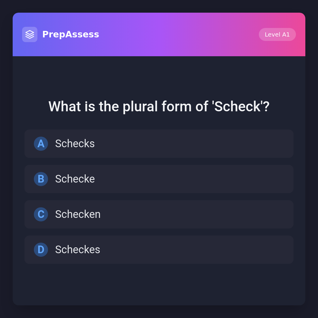 The plural form of 'Scheck' is 'Schecks'. German plurals often add an 's' for words borrowed from other languages. The other options do not correctly represent the plural form of 'Scheck'.
