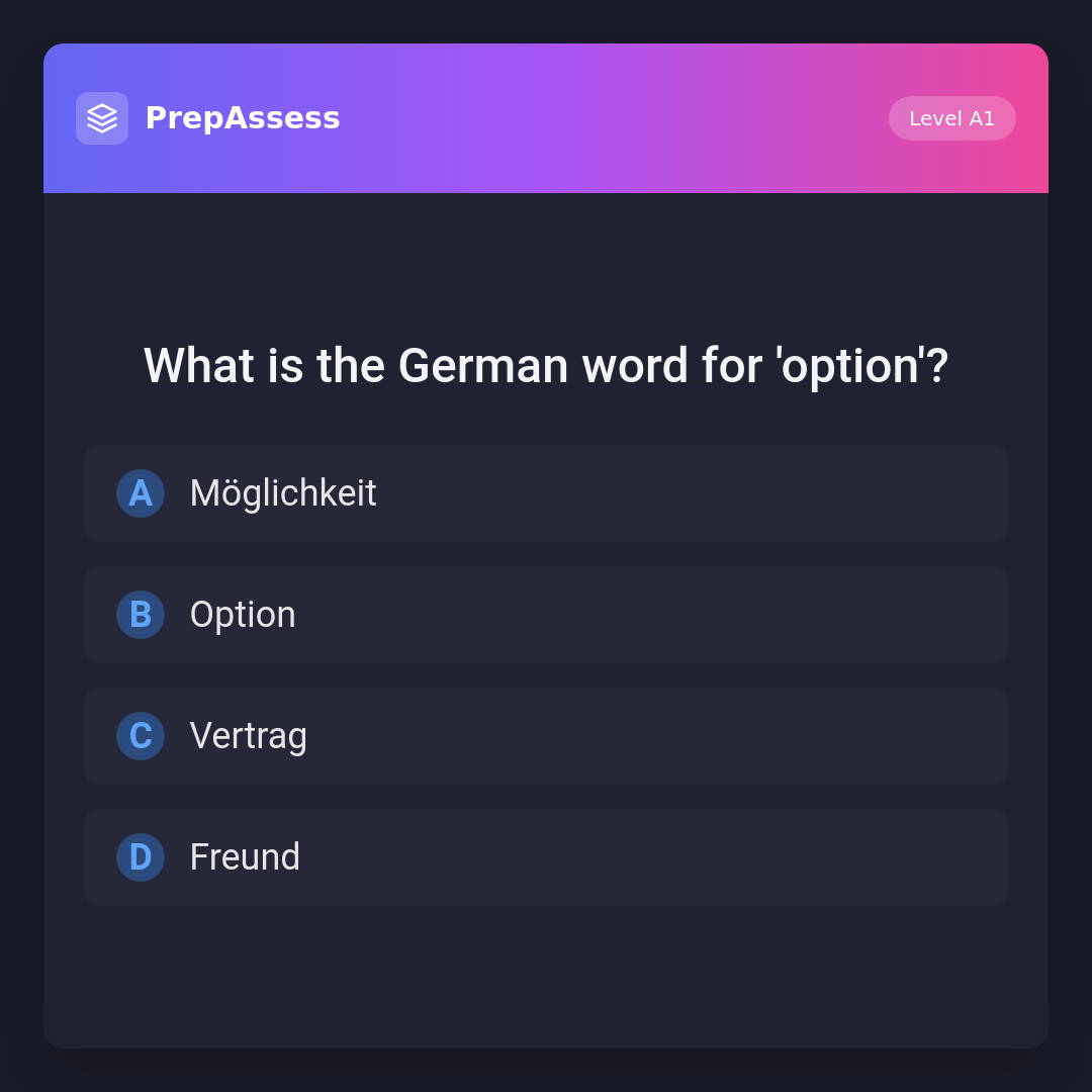 The correct German word for 'option' is 'Option'. 'Möglichkeit' means 'possibility', 'Vertrag' means 'contract', and 'Freund' means 'friend'.