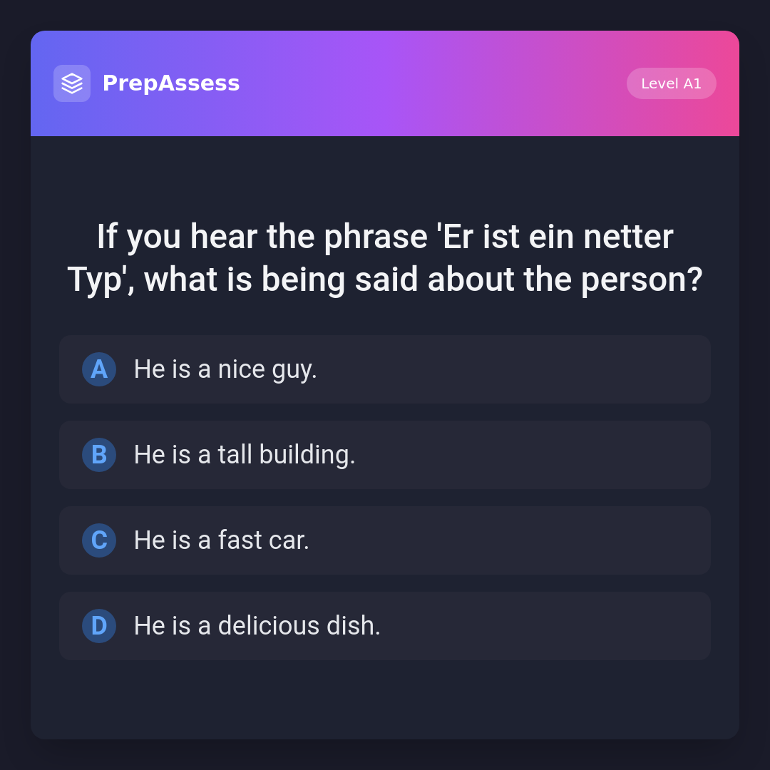 If you hear the phrase 'Er ist ein netter Typ', what is being said about the person?