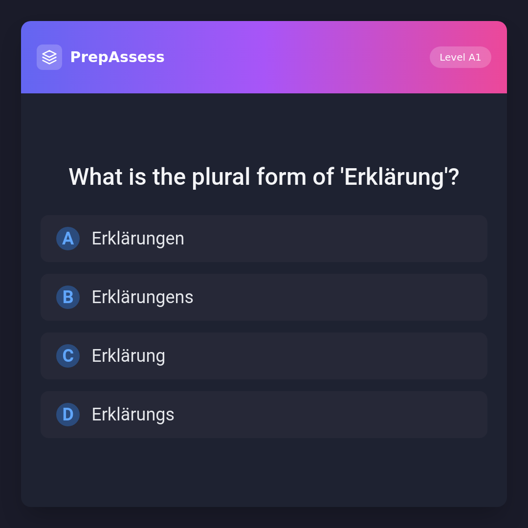 The plural form of 'Erklärung' is 'Erklärungen'. In German, many nouns add '-en' for the plural, not '-ens' or '-s'. 'Erklärung' is the singular form.