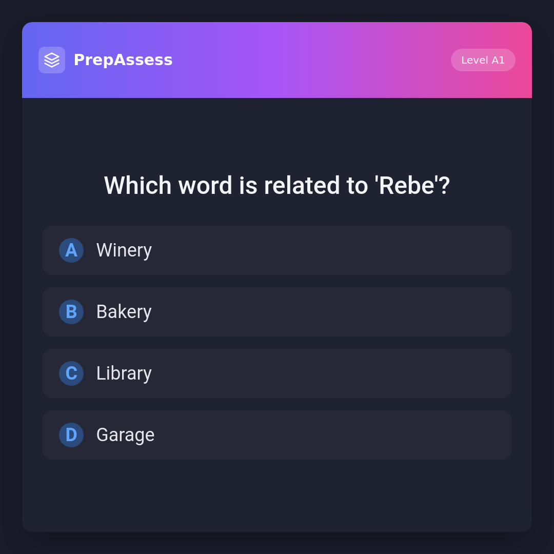 'Winery' is the correct answer because it is related to grape production, and a 'Rebe' is a grape vine. 'Bakery' (b), 'Library' (c), and 'Garage' (d) do not have a contextual relationship with grape vines.