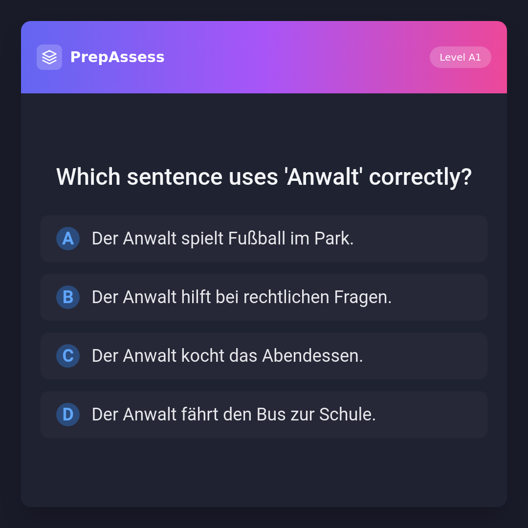 'Der Anwalt hilft bei rechtlichen Fragen.' is correct because a lawyer helps with legal matters. The other sentences incorrectly use 'Anwalt' in contexts related to playing football, cooking, or driving a bus.