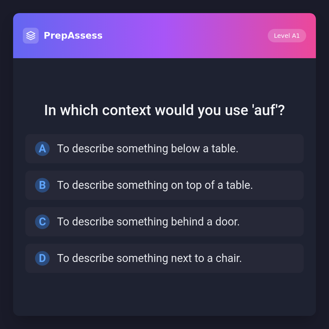'Auf' is used to describe something that is on top of a surface, like a table. Other contexts involve different prepositions: 'below' would use 'unter', 'behind' would use 'hinter', and 'next to' would use 'neben'.