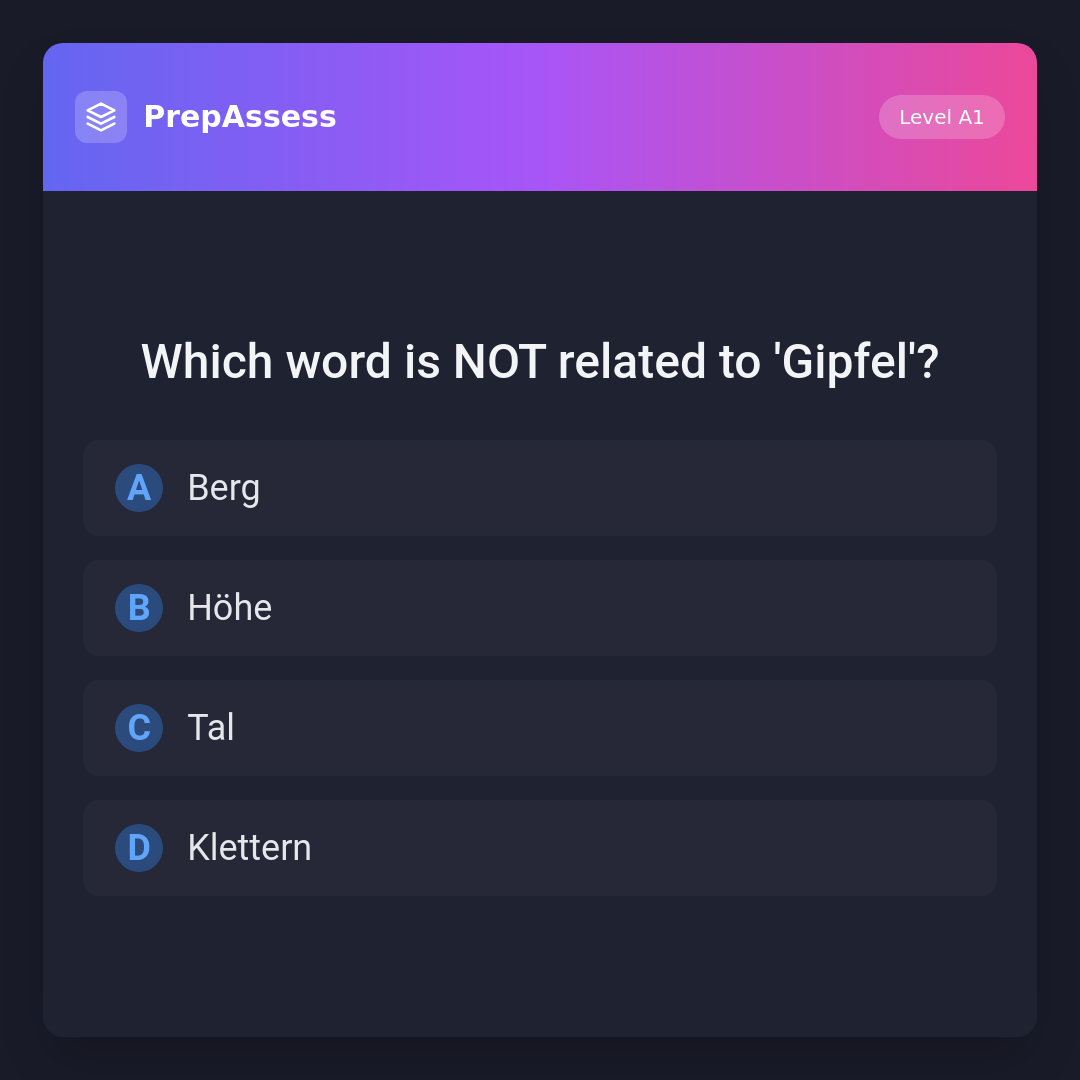 'Tal' means 'valley', which is not related to 'Gipfel' (summit). 'Berg' means 'mountain', 'Höhe' means 'height', and 'Klettern' means 'climbing', all of which are related to the concept of a summit.