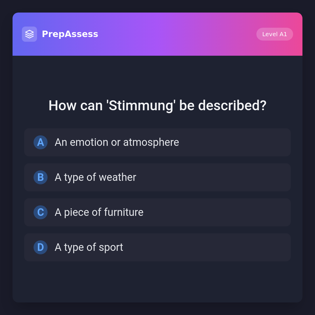 'Stimmung' refers to an emotion or atmosphere, often describing the feeling or mood in a particular setting. It is not related to weather, furniture, or sports.
