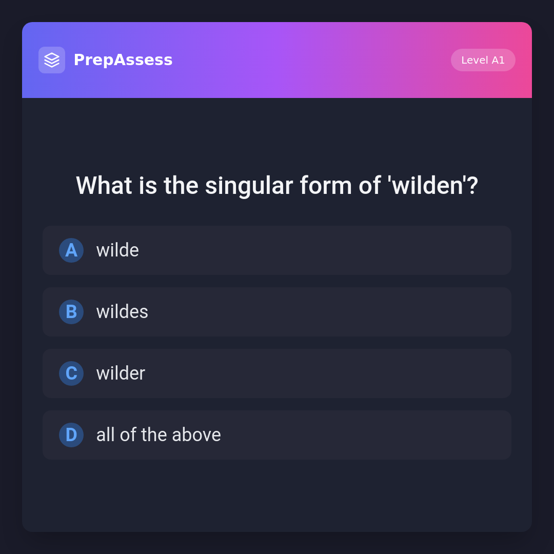 The singular form of 'wilden' can be 'wilde', 'wildes', or 'wilder', depending on the gender and case of the noun it modifies. 'Wilde' is used with feminine nouns, 'wildes' with neuter, and 'wilder' with masculine nouns in nominative case.